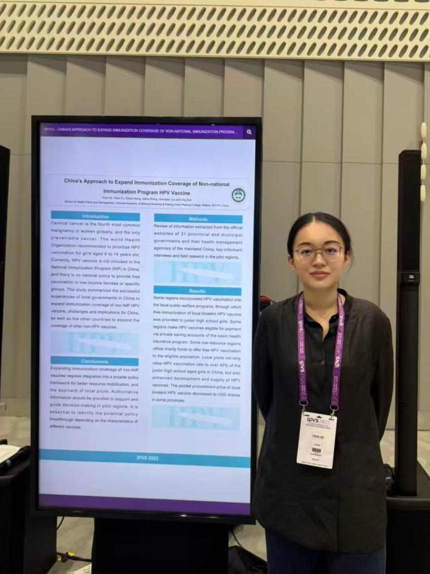我院药物政策课题组2025级硕士研究生何胤琪代表课题组参会并进行了e-Poster口头汇报,分享了课题组近期在“疫苗交付研究创新实验室”(VaxLab)支持下开展的“扩大HPV疫苗接种实施策略”的研究成果。该研究对中国采取自下而上、试点先行、逐步推开、直至将HPV疫苗接种适时纳入国家免疫规划的决策过程、成功经验、以及对其他发展中国家的启示进行了总结。中国先行试点地区有的将适龄女生免费接种HPV疫苗纳入当地“政府民生实事项目”;有的通过当地基本医疗保险职工参保人的个人账户支付本人及其家人接种HPV疫苗;部分资源匮乏地区则利用慈善基金及企业捐赠,为符合条件的人群免费提供HPV疫苗。截至国家宣布将HPV疫苗接种纳入国家免疫规划时,先行试点不仅已将中国初中年龄段女生的HPV疫苗接种率提高到了40%以上,还通过省级集中采购将国产二价疫苗价格降至每剂27.5元,远低于国际疫苗采购组织的采购价格。试点的逐步推开促进和强化了国产疫苗的开发和供应能力,目前完全可以满足国家免疫规划每年需要的约1500万剂国产二价疫苗供应。